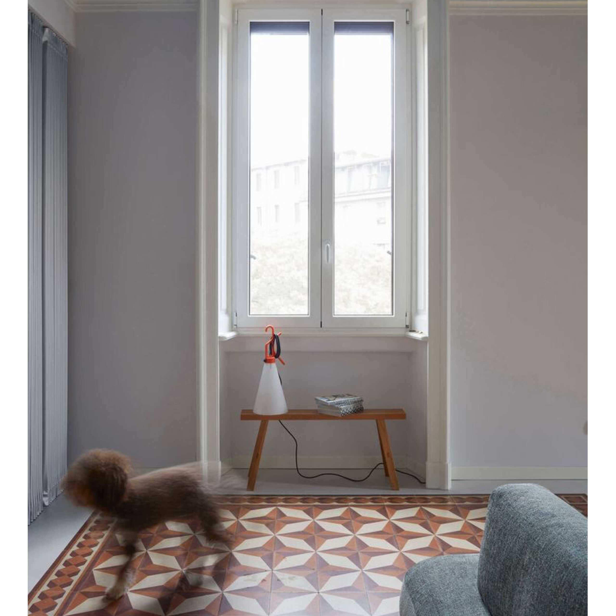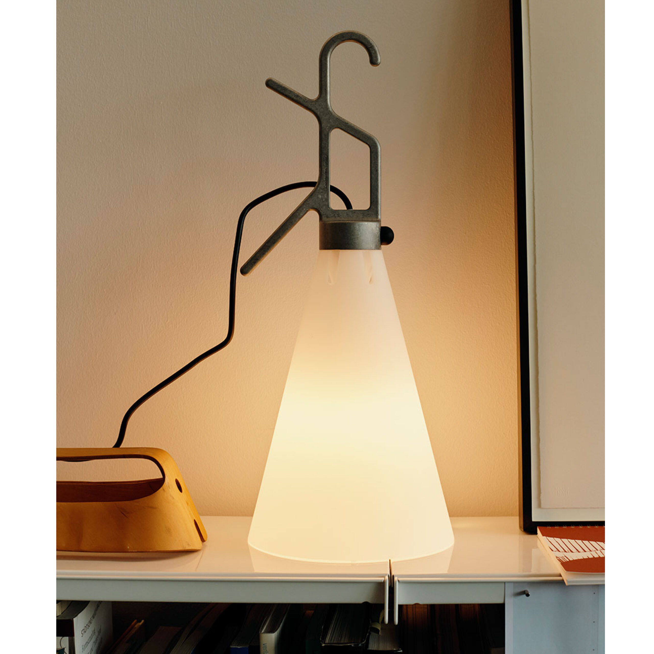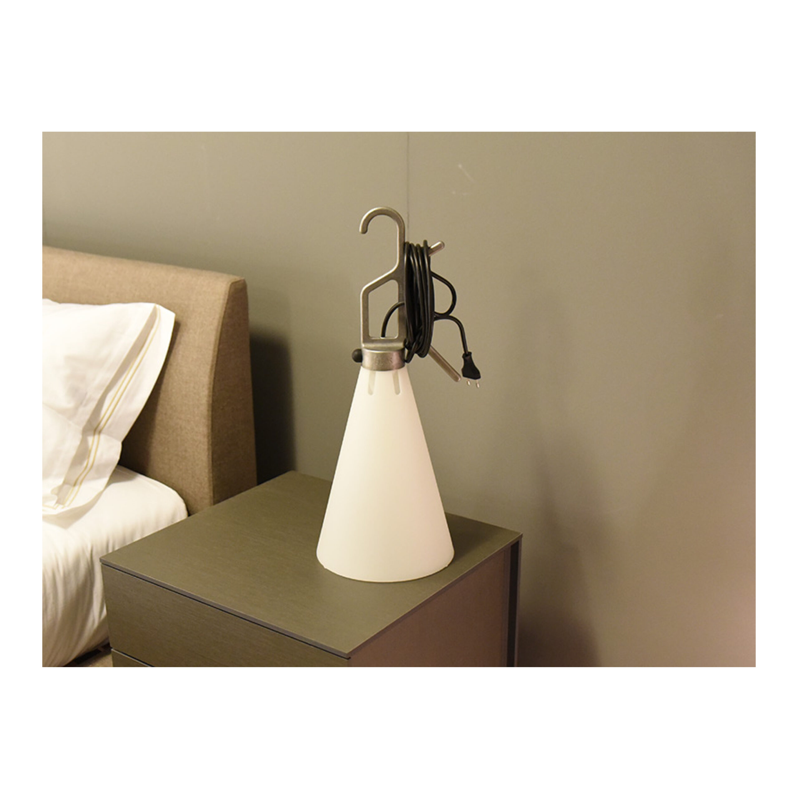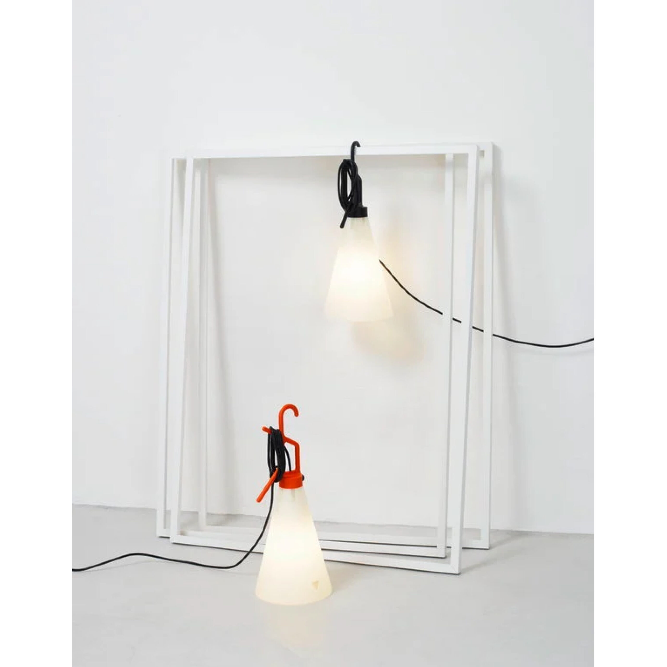 A utility light that seamlessly matches style and functionality, it is made entirely from hard-wearing, water-resistant, injection-moulded polypropylene, making this piece suitable for use both indoors and out. Featuring an opaque conical diffuser and a brightly coloured handle, the design is simple yet eye-catchingly graphic. The handle can be used as a hook or to wind up the electrical cord.